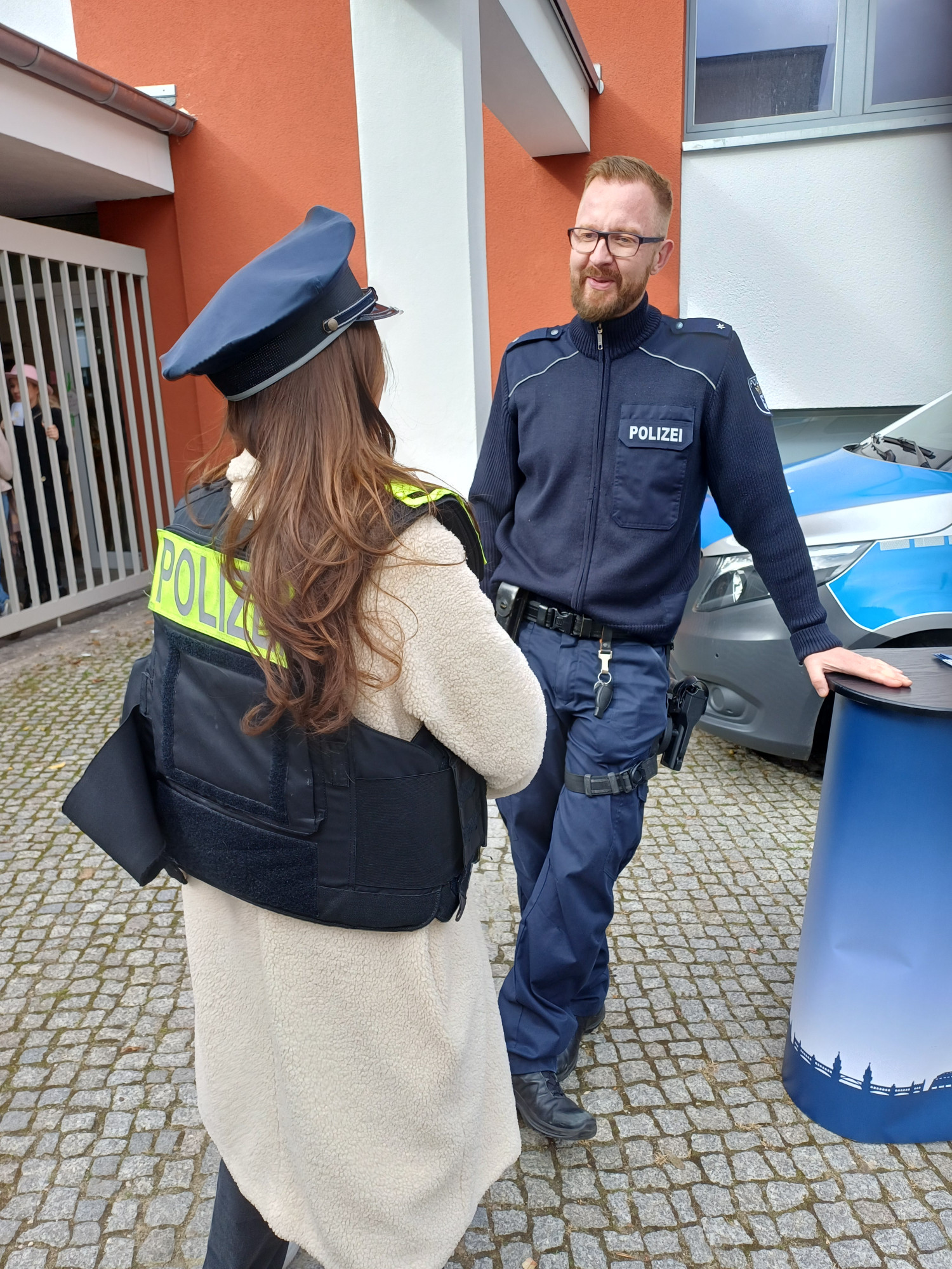 Herr Kamieth und Herr Sengül von unserem Polizeiabschnitt 54 waren mit einem Polizeiwagen, Ausrüstungsgegenständen und Informationen zu einer Karriere bei der Polizei ein allseits beliebter Anlaufpunt direkt am Eingang. In relativer Nähe wiesen auch unsere Jugendschulsanitäter der Malteser auf ihr Engagement an der Schule hin.