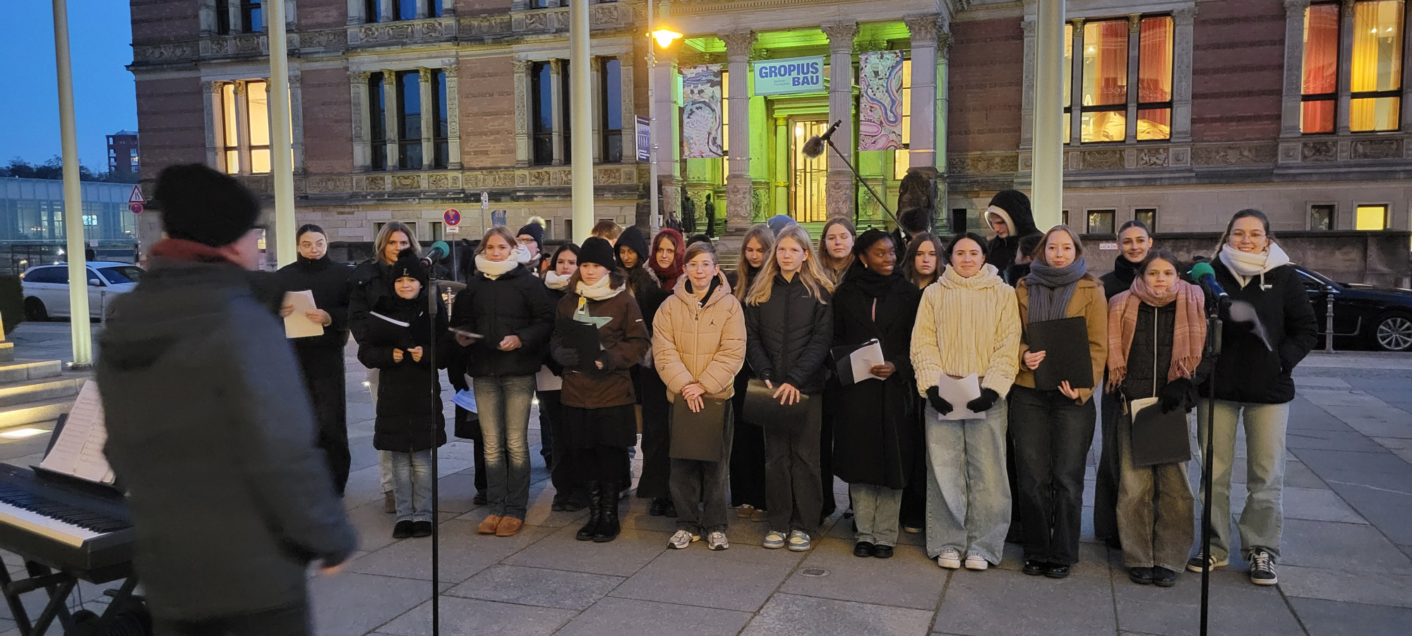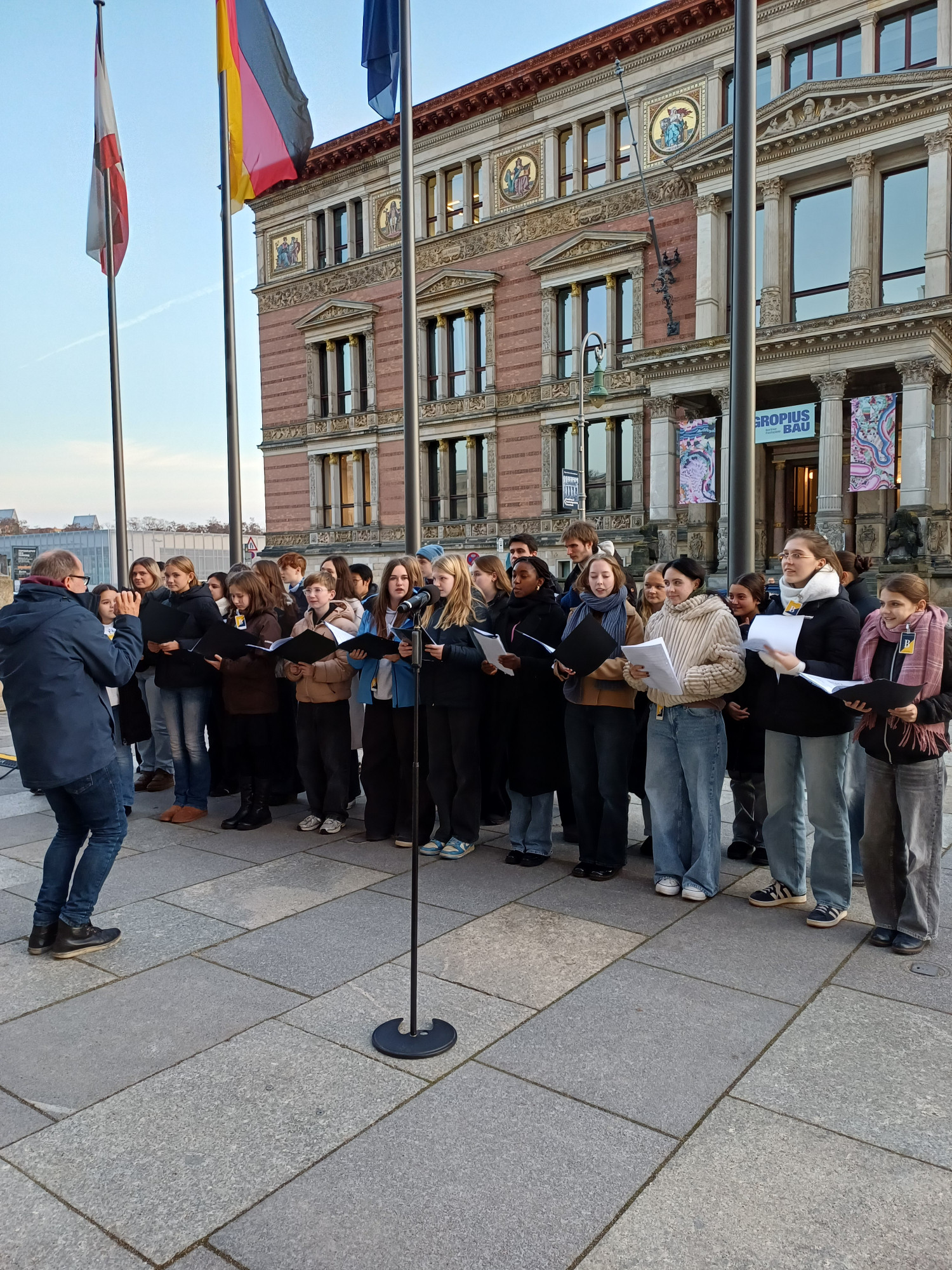Unser Schulchor, der auch schon vor zwei Jahren die Illumination musikalisch gestaltet hatte, war bereits am frühen Nachmittag angereist, um bei Kälte und Wind zu proben.