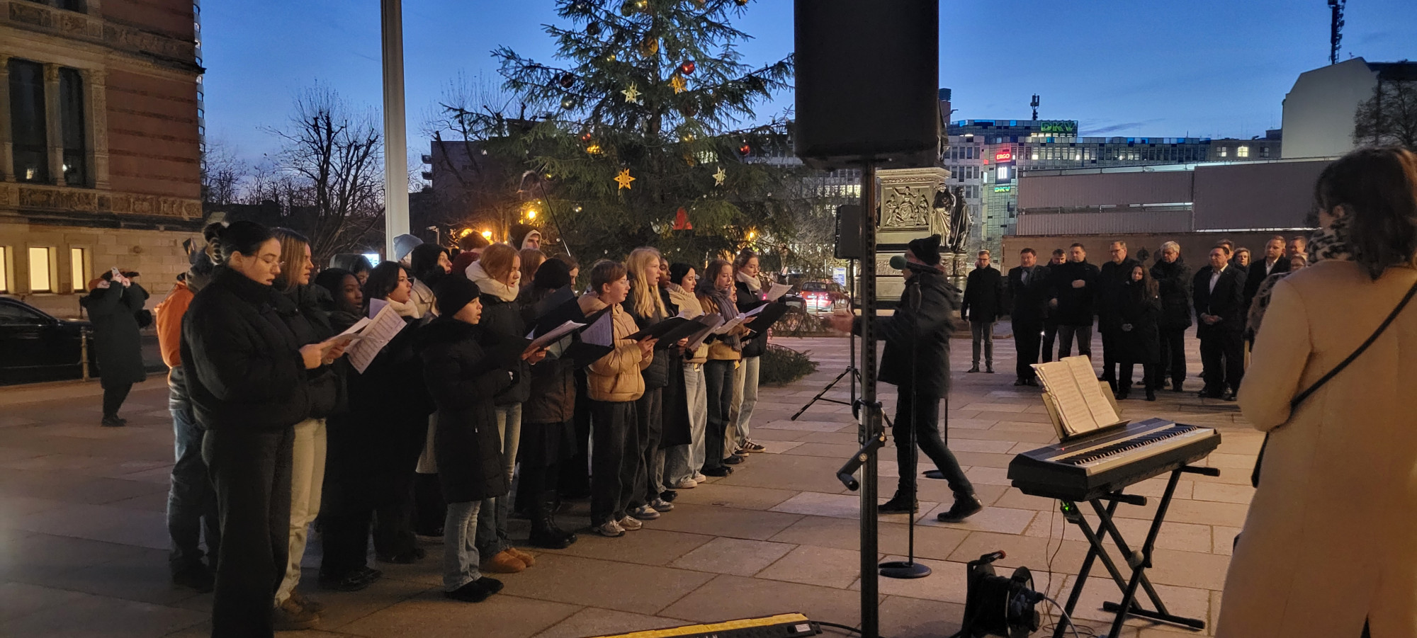 „Come on, let’s go to Bethlehem“ eröffnete stimmungsvoll die Illuminationsfeier. Bevor ein gemeinsamer Knopfdruck die Lichter am Weihnachtsbaum zum Leuchten brachte, betonten die Präsidentin des Abgeordnetenhauses sowie Senatorin Bonde in ihren Reden die Bedeutung der vor uns liegende Adventszeit. Der besondere Charakter dieser Zeit wurde auch musikalisch spürbar, als unser Chor „Es kommt ein Schiff geladen“ und „Maria durch ein Dornwald ging“ sang.