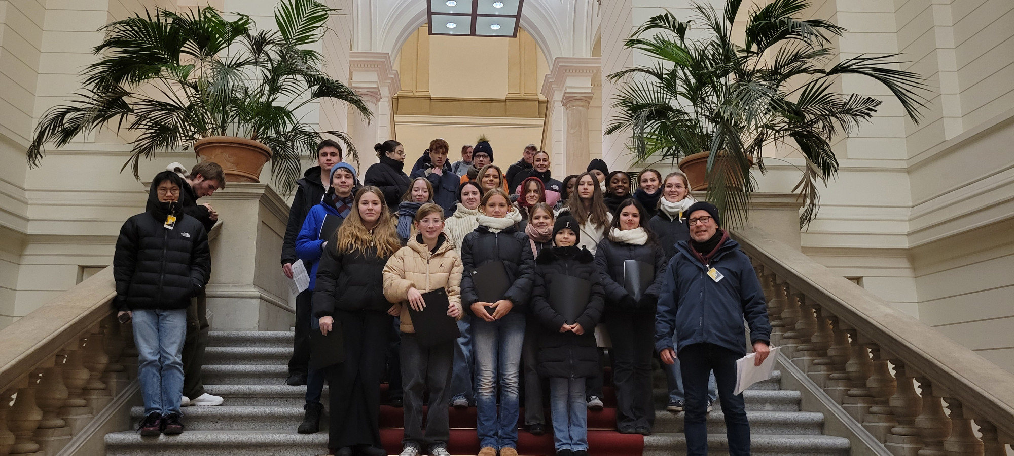 In der Dunkelheit des späten Nachmittags versammelten sich Mitarbeitende des Abgeordnetenhauses und Gäste aus Politik und Gesellschaft vor dem Abgeordnetenhaus, um an der Feier teilzunehmen.