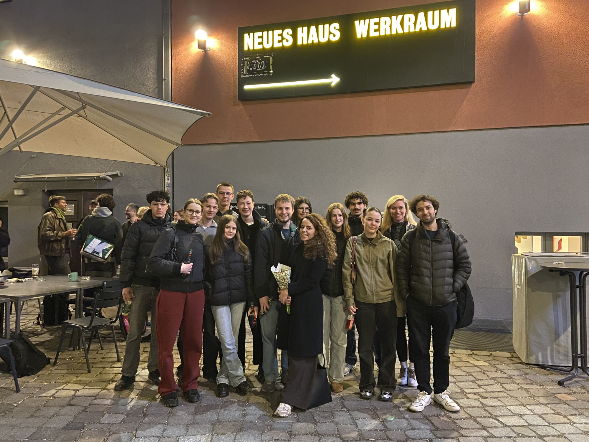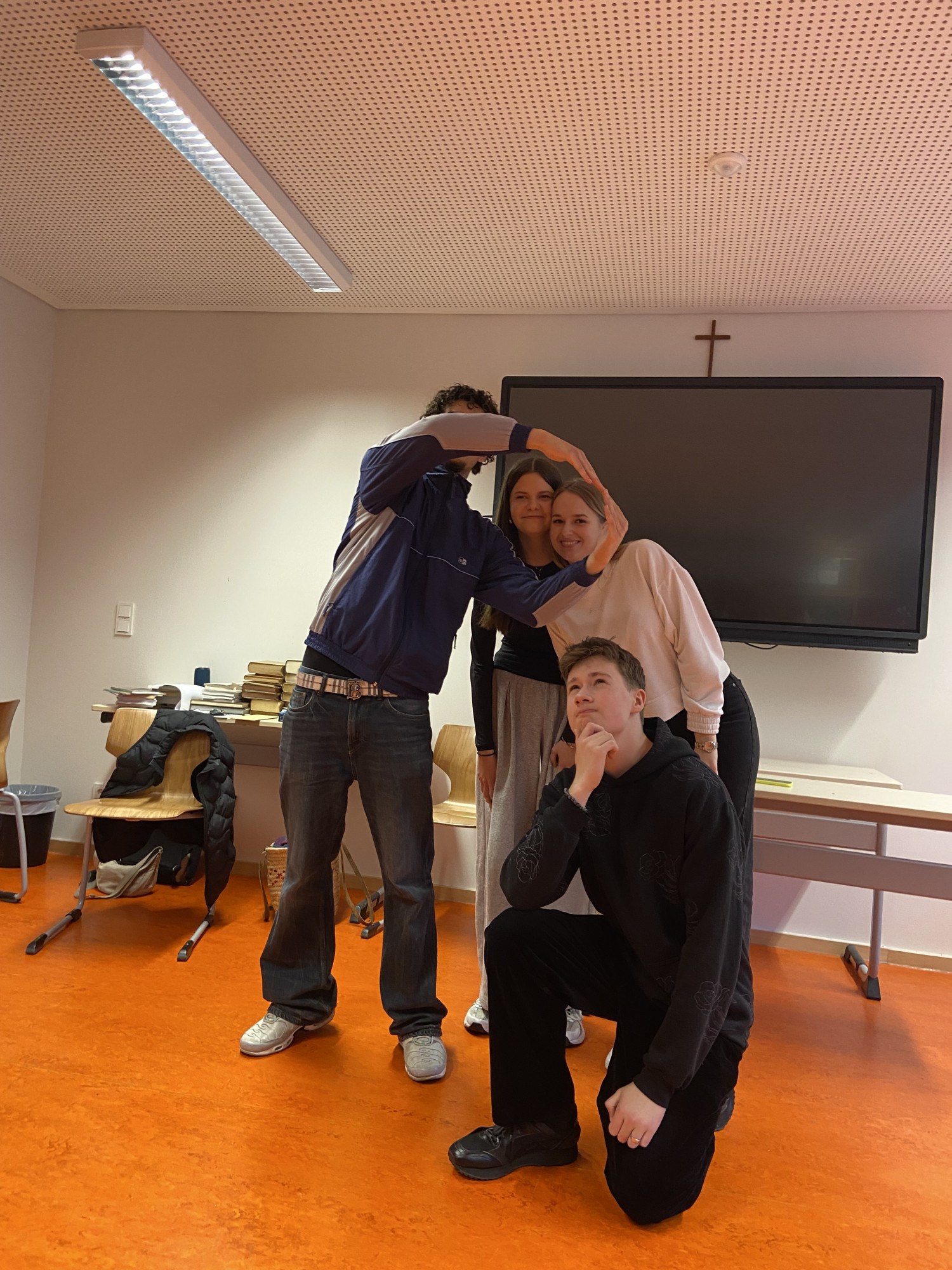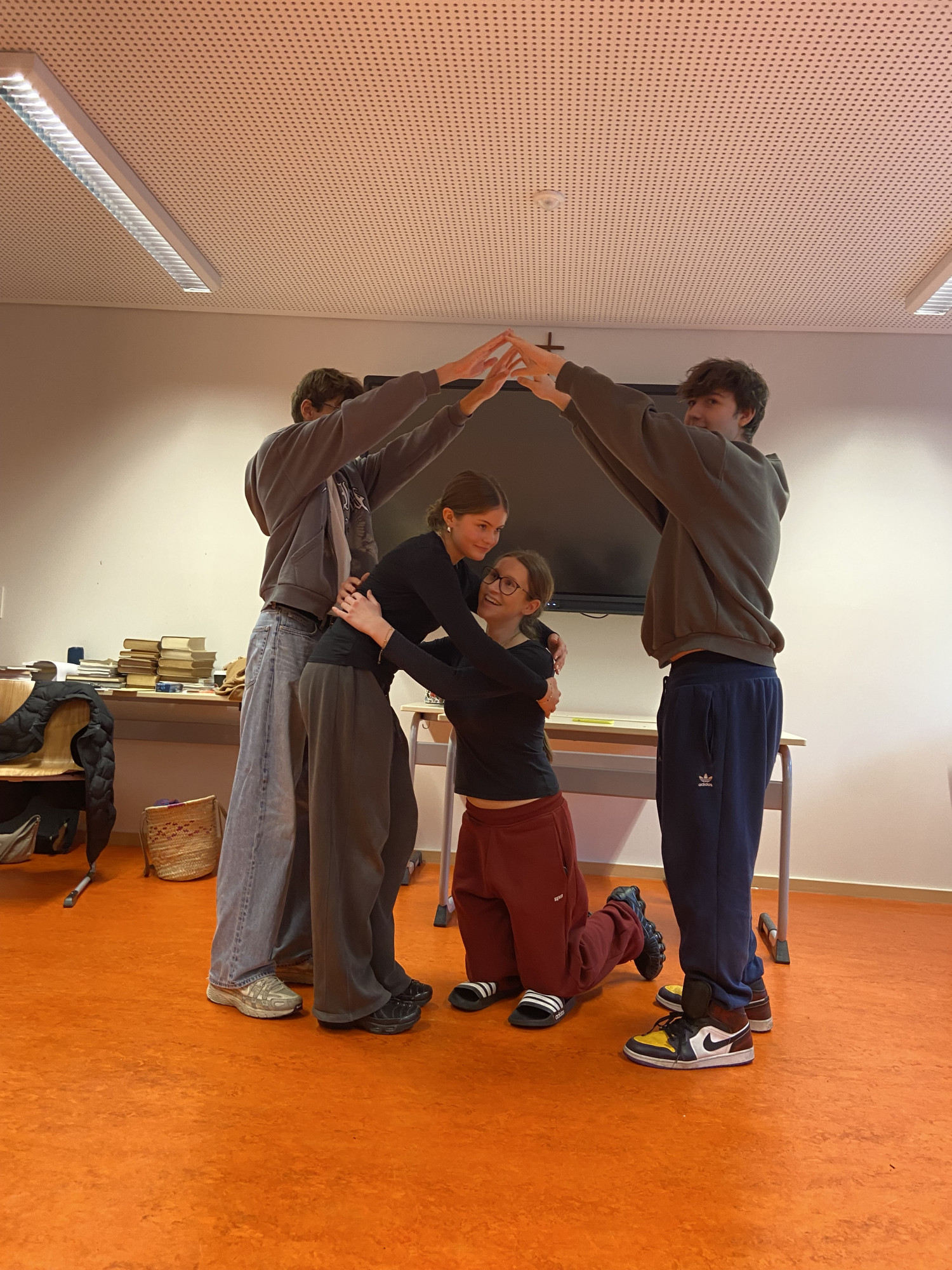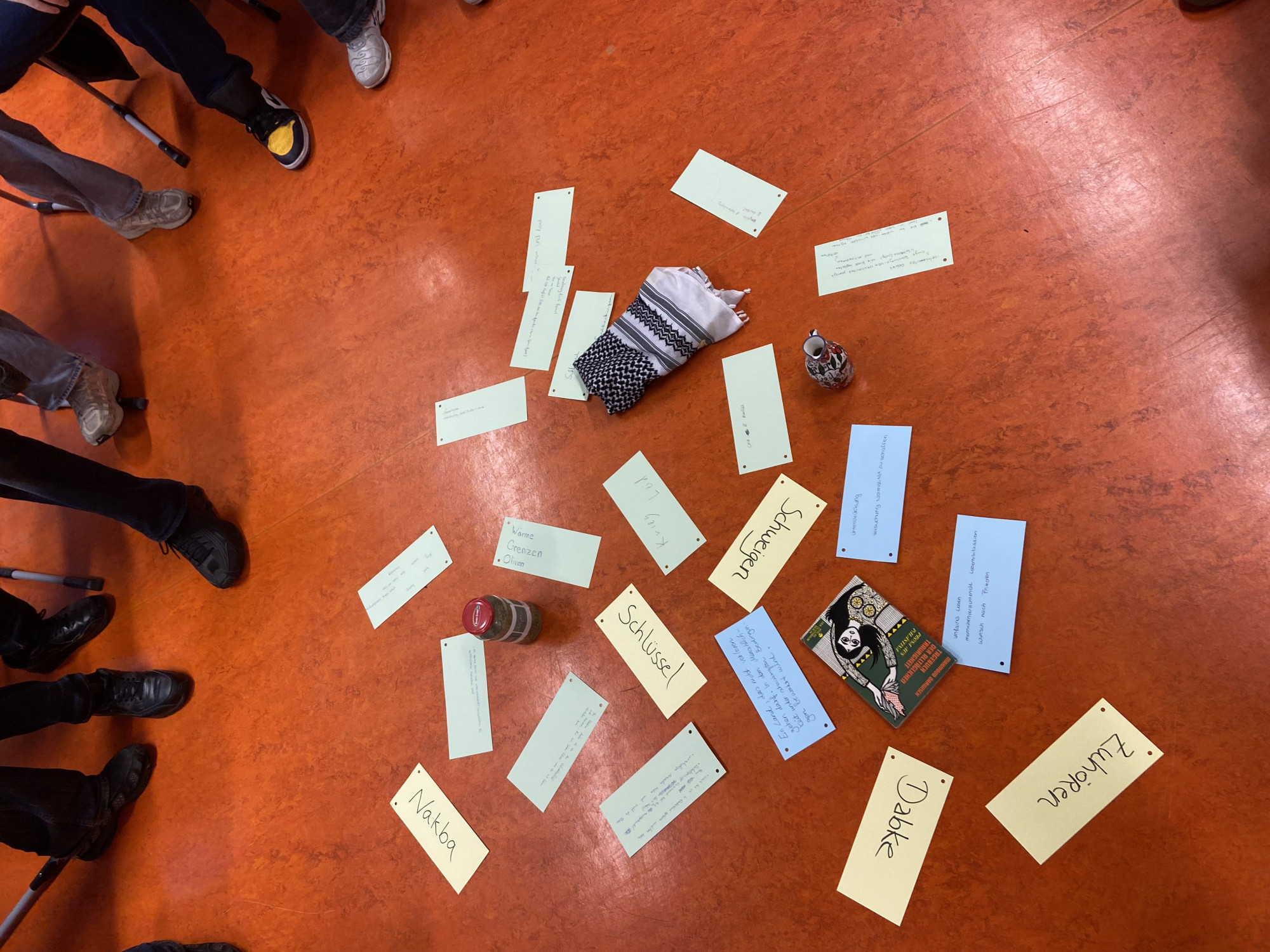 In der darauffolgenden Woche kam eine Theaterpädagogin des BE zu uns in den Kurs, um diese Eindrücke noch einmal nachzubereiten. Wir sprachen zunächst darüber, woran wir nun denken, wenn wir „Palästina“ hören. Neben all dem Leid und dem dort herrschenden Krieg, war das dank der Lesung auch der Geruch von Thymian oder Kaffee mit Kardamon, Tänze und Lieder, von denen Alena uns einen Eindruck gab und die viel Lebensfreude und Widerstandskraft vermitteln. Dann berichtete jeder von uns anhand eines mitgebrachten Gegenstandes, was für uns „Zuhause“ bedeutet und wir dachten gemeinsam darüber nach, wie wichtig uns diese Erinnerungsgegenstände sind, als Teil unserer Identität. Für Palästinenser*innen ist dies oft der Schlüssel zu dem Haus, aus dem sie vertrieben wurden, oder aber Fotos von verstorbenen Familienmitgliedern. Zum Abschluss inszenierten wir in Kleingruppen prägende Momente unseres Lebens und vollzogen so die Methodik nach, mit der Aleena bei ihrer Lesung vorgegangen war.